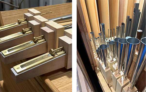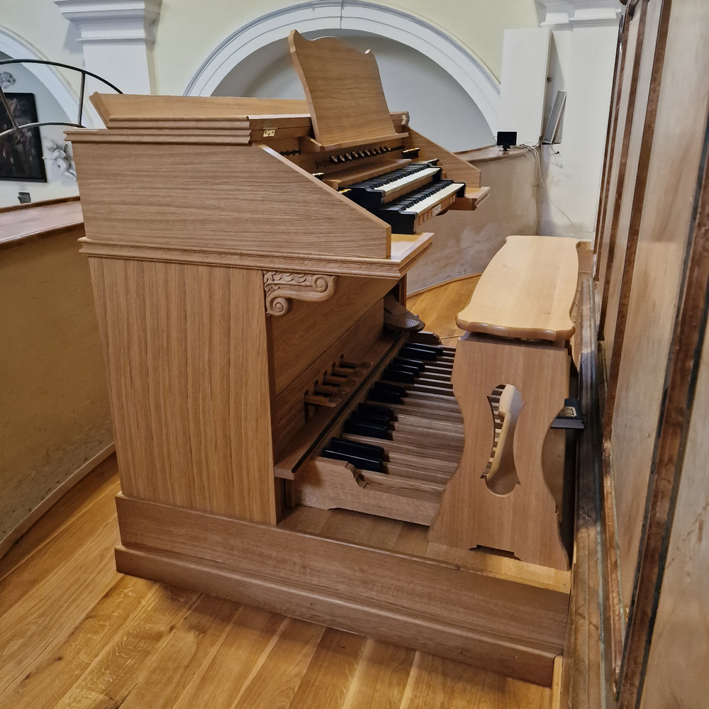 Lavice s mechanismem pro nastavování výšky je inspirována varhanami v Bučovicích a nový notový pult byl doplněn o manubria z ebenového dřeva s porcelánovými štítky v bílé, oranžové a modré barvě. Kromě toho byl vyroben i mikrospínač pro zapínání ventilátoru. Šlapky pro spojky vznikly jako kopie z úsovských varhan, zatímco šlapky pro Crescendo a SW se inspirovaly varhanami z plzeňské synagogy.