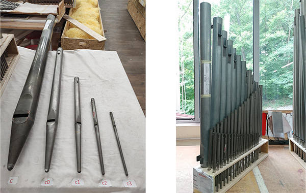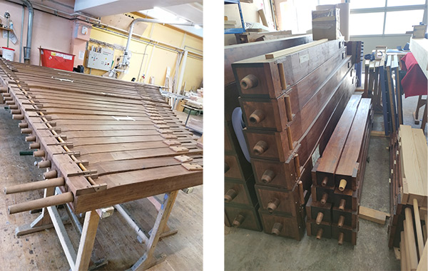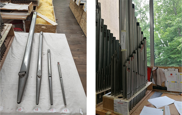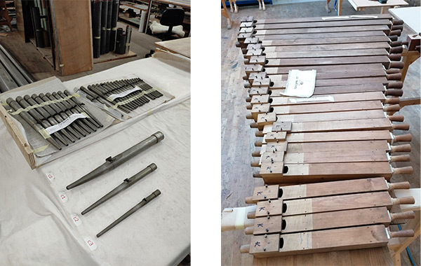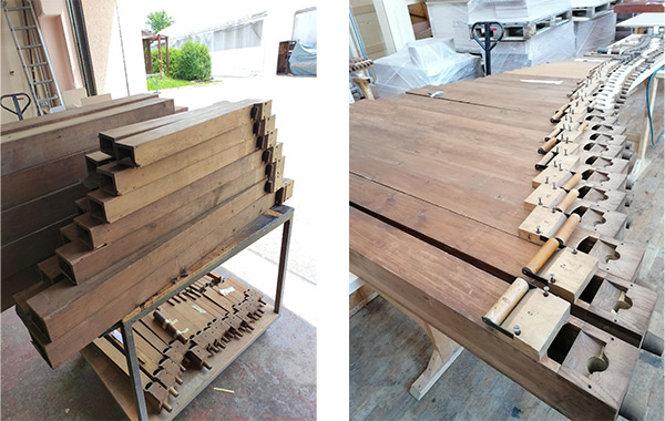 The organ table was made as a restoration copy based on the model historical organs in Úsov and Rohl. The new table is made in the spirit of these patterns, and its manual has a range of C-g3 (56 notes), while the pedal is C-f1 (30 notes). Bone and ebony were used to make the keyboards, with the keyboard sides modelled on the Ušov organ. An oak cabinet with a platform and a new oak pedal keyboard were also made, both based on the model from Rohle.