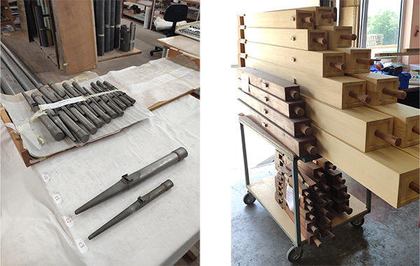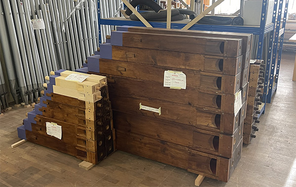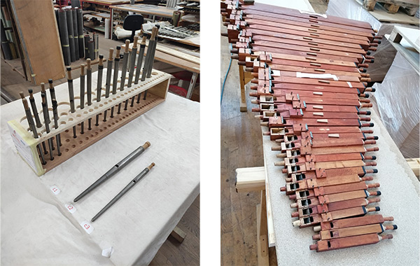 The bench with a mechanism for height adjustment is inspired by the organ in Bučovice and the new music desk was completed with ebony manubria with porcelain labels in white, orange and blue. In addition, a microswitch for switching on the fan was made. The treadles for the couplers were copied from the organ in Usa, while the treadles for the Crescendo and SW were inspired by the organ in the Pilsen synagogue.